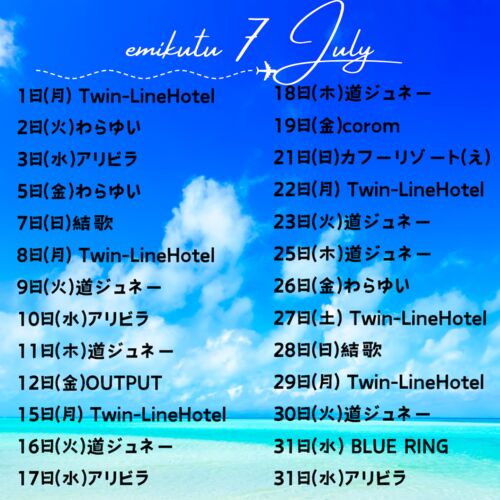 emikutu7月のスケジュール 1日(月) Twin-Line Hotel 2日(火)わらゆい 3日(水)アリビラプールサイド 5日(金)わらゆい 7日(日)結歌 8日(月) Twin-Line Hotel 10日(水)アリビラプールサイド 11日(木)道ジュネー 12日(金)OUTPUT 15日(月) Twin-Line Hotel 16日(…